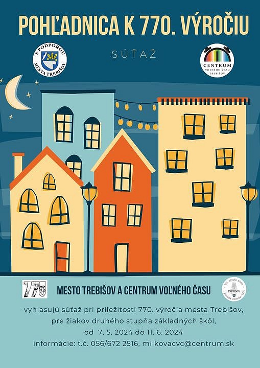 Mesto Trebišov a oddelenie školstva v spolupráci s Centrom voľného času v Trebišove vyhlasujú súťaž „Návrh pohľadnice k 770. výročiu mesta Trebišov.“ Obsahom nemusia byť iba historické pamätihodnosti, ale aj súčasné dominanty mesta.